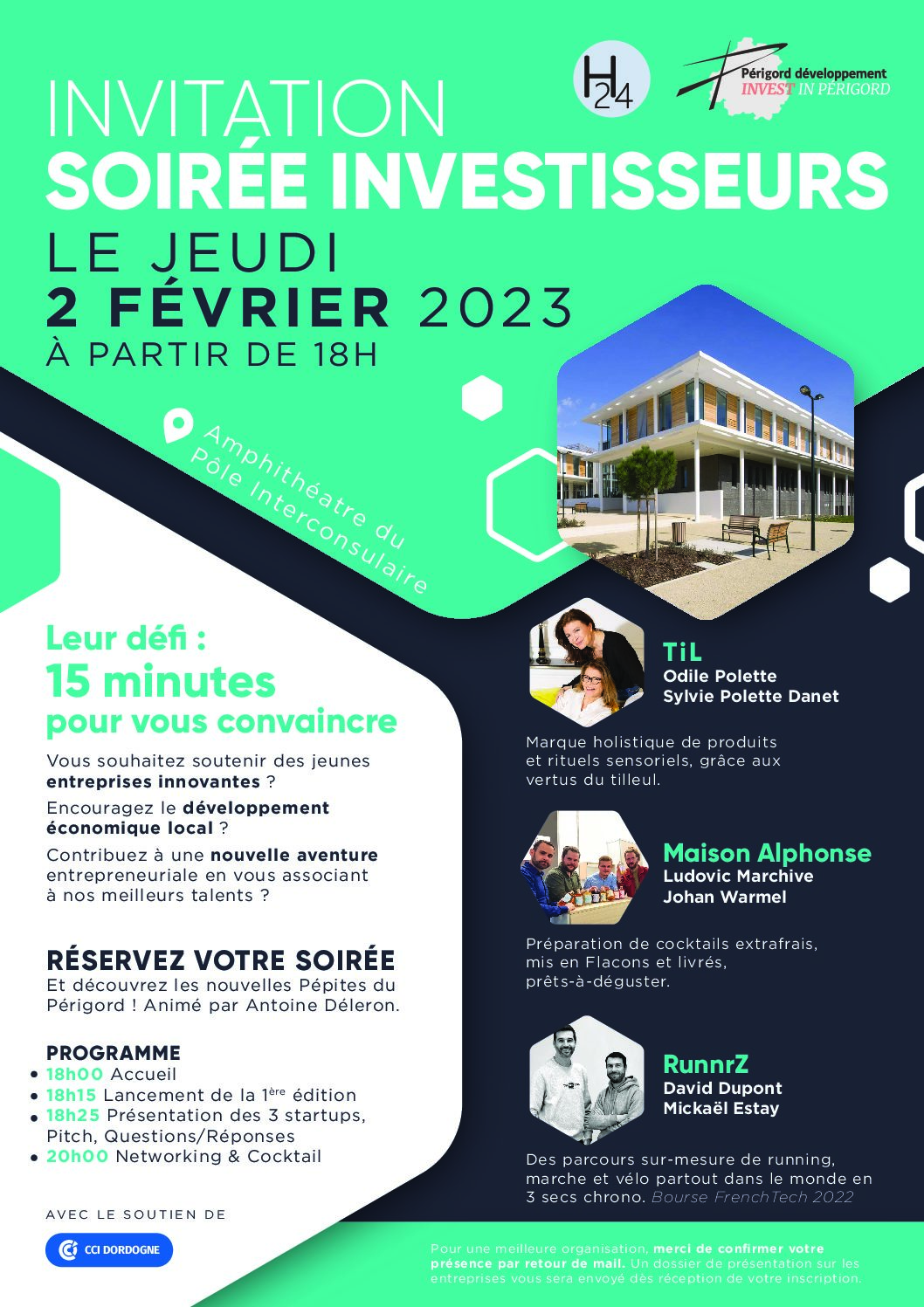 En savoir +L’incubateur H24 et l’agence Périgord Développement organise la 1ère édition de la Soirée Investisseurs qui se déroulera le Jeudi 02 février 2023 à partir de 18 heures au Pôle Interconsulaire à Coulounieix-Chamiers. L’objectif principal de cette soirée est de soutenir et développer de jeunes pousses ou start-up porteuses d’innovation pour le développement économique de notre territoire. Vous êtes intéressé(e)s […]